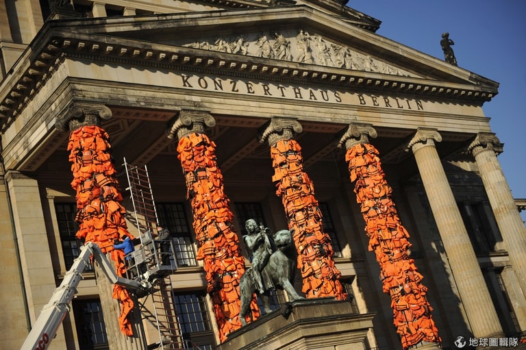 近日,風格前衛的中國藝術家艾未未又有新作,他將 1萬4千件廢棄的橘色救生衣從希臘運到德國柏林音樂廳,將大門的柱子黏滿了救生衣,藉此來強調每天有多少難民冒險渡海來到歐洲。