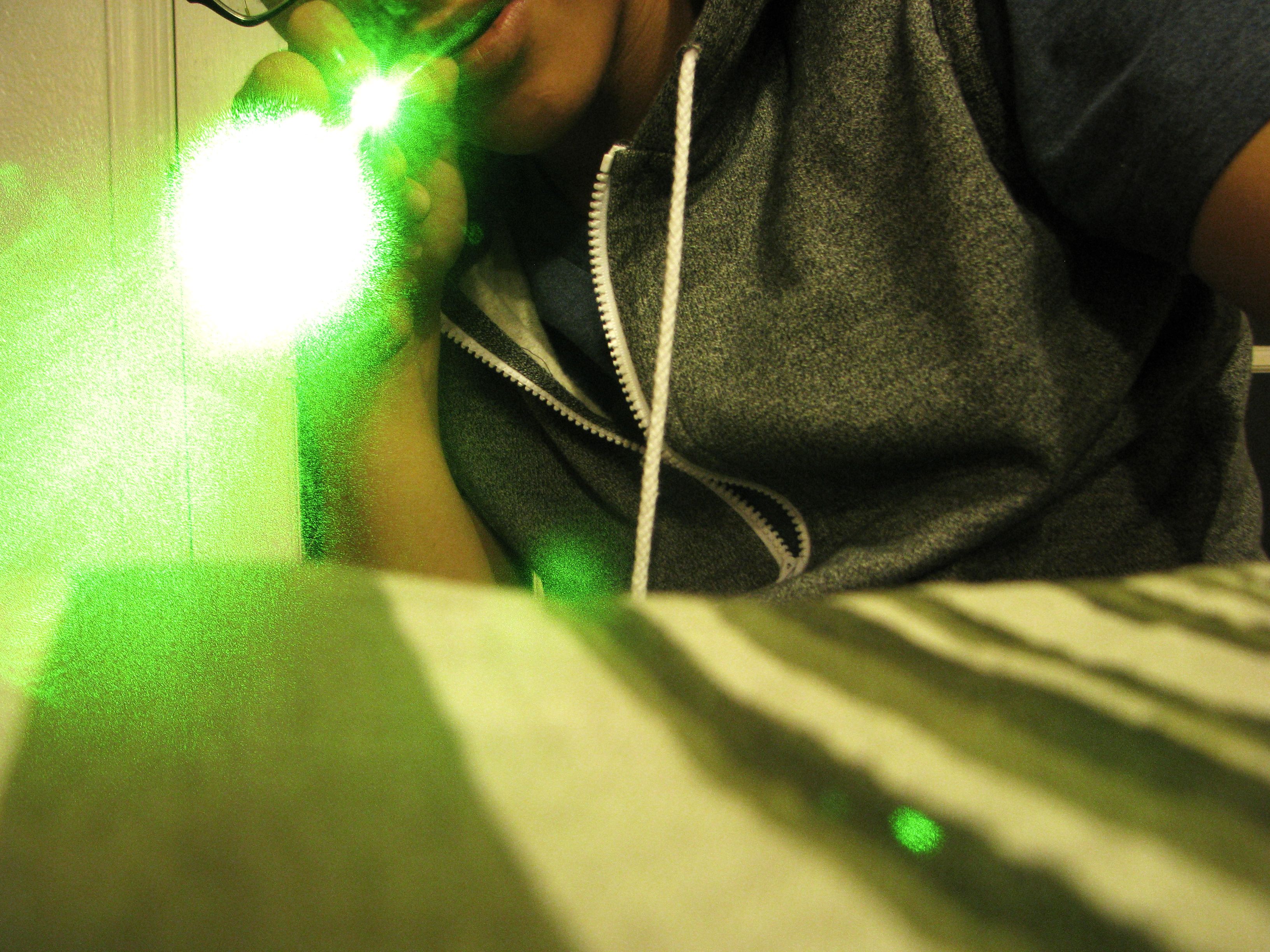 一名男子手中拿著綠色的雷射光筆直射鏡頭,高強度的雷射光會讓人視網膜受損。