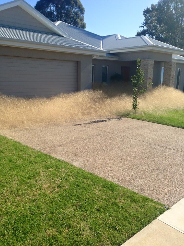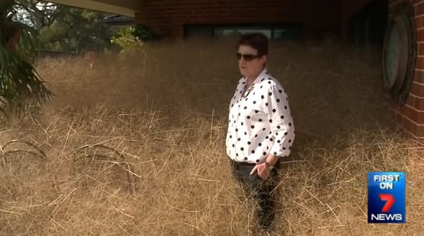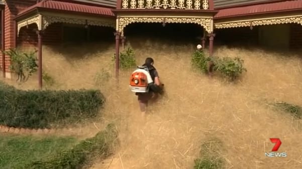 近日,住在澳洲東北部鄉間旺加拉塔城(Wangaratta)的居民好煩惱,因為他們的家園被俗稱「毛慌草」(hairy panic)的一種乾草給淹沒。除了放在花園的桌椅和草地都被淹沒外,人們要出門還得先將門外一層樓高的乾草鏟開才看得見路,當地居民一天就得清理好幾次。