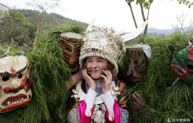 扮演「芒蒿神」的苗族男人,伸手往一名女性臉上抹泥巴,祝福她接下來一年有好運。根據報導,苗族男性會在芒蒿節這天穿上野草做的草簑,戴上面目猙獰的面具扮演芒蒿神,在泥巴地裡打滾、跳舞並追逐現場的村民和遊客。在苗族的傳說中,「芒蒿」身穿草蓑,模樣怪異可怕,但卻法力無邊,無所不能,只要他的手觸摸到任何人的手,被摸者就能大吉大利,風調雨順,五穀豐登,百病不生。