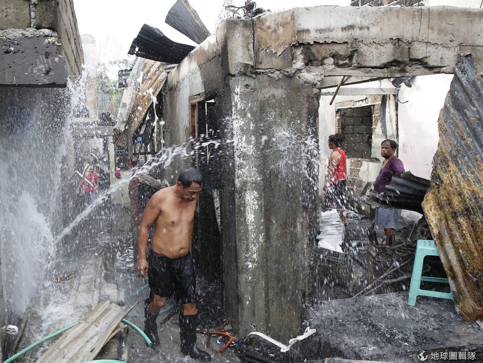 男人經過爆裂的水管。菲律賓的文珍俞巴市(Muntinlupa)在 22號晚上發生不明大火,燒毀大約 250棟房子,同時也使得 1千多人失去自己的家。