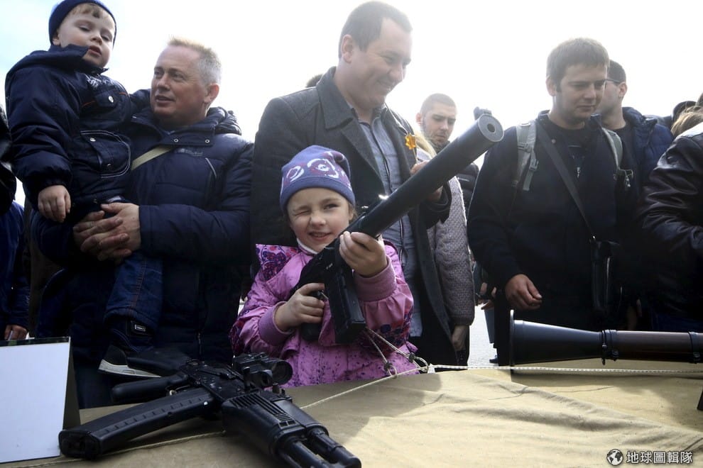 克里米亞當地的民眾看著各式武器,慶祝祖國保衛者日(Defender of the Fatherland)。根據《維基百科》,每年 2月23日是俄羅斯、白俄羅斯和烏克蘭的祖國保衛日,全國放假一天。「祖國保衛者日」是個軍人的節日,一般要舉行閱軍和遊行等活動。俄羅斯人也將祖國保衛者日看做是一個「男人節」,這一天婦女們會向自己的丈夫贈送禮物。
