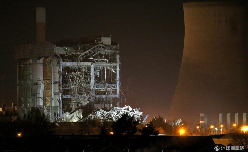 緊急救援部隊用燈光照著倒塌的建築。英國迪德科特(Didcot)鎮的一個廢棄發電廠有部分倒塌,造成至少 1人死亡,3人失蹤。