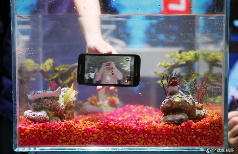手機界盛事「世界行動通訊大會」(Mobile World Congress)在西班牙巴塞隆納開跑,大會上,主持人把一台「Moto G」手機放進水裡,展示它的性能。