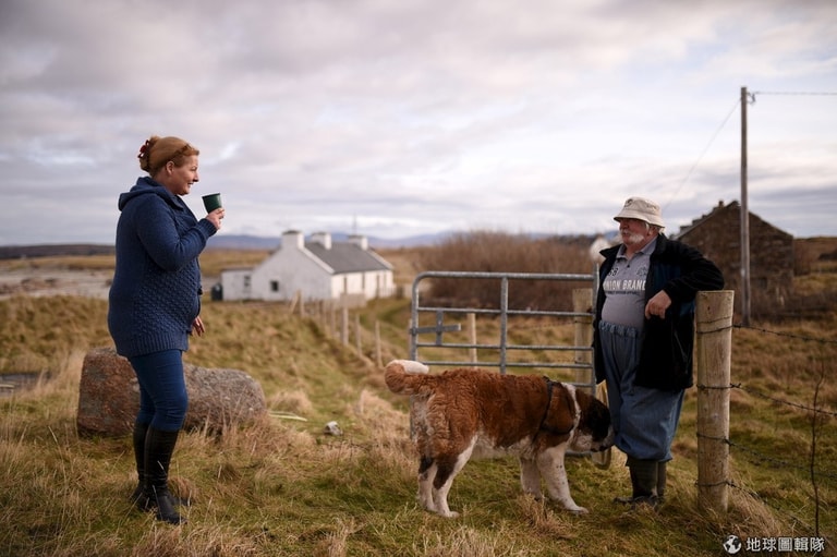 偏遠的茵尼斯菲島(Inishfree)上,克莉(左,Philomena Currid)正站在投票所外面跟斯列維克(Hans Schleweck)聊天。愛爾蘭在 26號舉辦大選,小小的茵尼斯菲島提早愛爾蘭本土一天選舉,當地登記可以投票的選民只有 4個人,照片中正在聊天的克莉跟斯列維克就是其中的兩位。