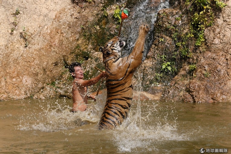 一隻老虎從水中跳起來,牠正在北碧府(Kanchanaburi)的老虎廟裡接受訓練。泰國的爭議性虎廟飼養多隻老虎,長期以來都被人懷疑他們虐待動物或是進行黑市買賣。日前,泰國政府拒絕發動物園執照給虎廟,並開始調查虎廟是否有走私野生動物的行為。