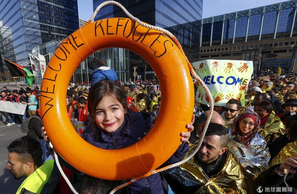 一名小女孩拿著寫有「歡迎難民」字樣的救生圈,參加位於首都布魯塞爾的遊行,要求歐盟更改移民政策,讓更多逃離家園的難民可以在歐洲落腳,追尋更美好的生活。