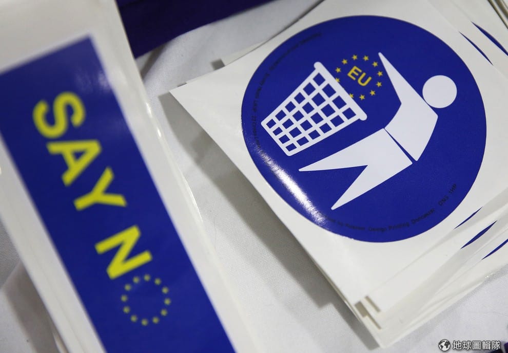 近日,英國正為要不要公投離開歐盟吵得不可開交,在支持脫歐的英國獨立黨(UKIP)大會上,可以看到印有將歐盟丟進垃圾桶圖案的貼紙,還有「對歐盟說不」字樣的標語。