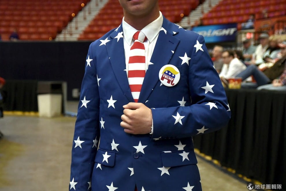 美國共和黨總統候選人川普(Donald Trump)的支持者戴著紅白相間的領帶,穿著藍底白星的外套,他胸前的別針俏皮地將共和黨的大象標誌加上了川普的招牌金髮,創意滿分。