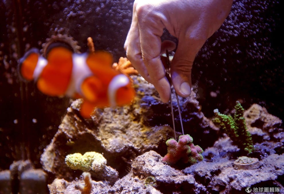 一名研究人員正在位於馬賽的珊瑚生物群落海洋農場工作,他用鑷子小心地擺弄珊瑚。這座農場提供飼養珊瑚給玩家、公共水族館還有研究如何治療傳染病的人員。