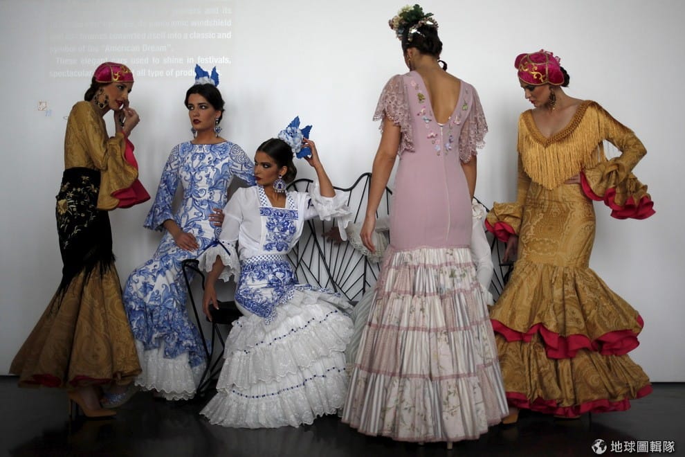 穿著華麗佛朗明哥舞衣的模特兒,在後台等著走上伸展台的那一刻。佛朗明哥是一種源於西班牙南部安達魯西亞地區的藝術,舞者們手拿響板或扇子,身體鏗鏘有力地隨著音樂踏出舞步,間以歌者的美妙的歌聲,和聞名全球的鬥牛一樣是西班牙廣為人知的特色。