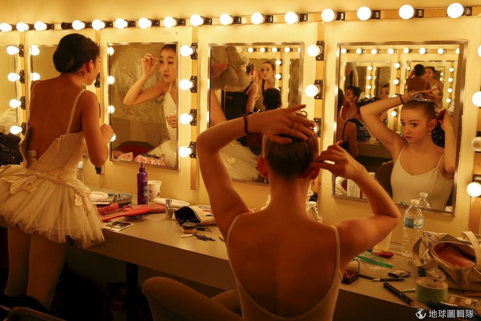 芭蕾舞蹈學校的學生,對著鏡子確認妝容,為即將到來的表演做好準備。
