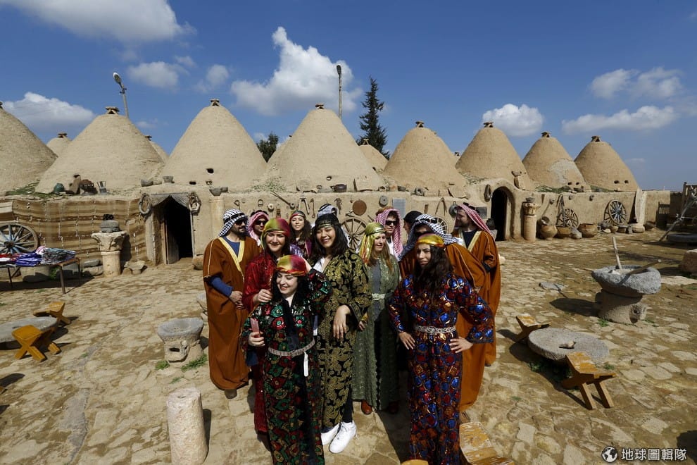 一群遊客穿著傳統服飾來到東南部的古城哈蘭(Harran),和當地的傳統建築蜂巢屋拍照。除了特色建築,土耳其也有許多宗教遺跡,第一大城伊斯坦堡的藍色清真寺和聖索菲亞大教堂就是個例子。