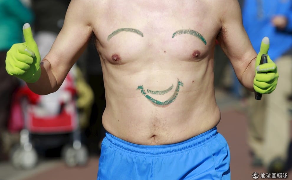 一名參加「半裸馬拉松」的男子,用簡單幾筆在身上畫出一張大大的笑臉,雙手比出大拇指開心地奔跑。一年一度的「半裸馬拉松」要求跑者裸上身,藉此凸顯對環境友善的生活方式。相對於亞洲,歐美國家則推出裸體騎腳踏車活動,推廣單車運動。