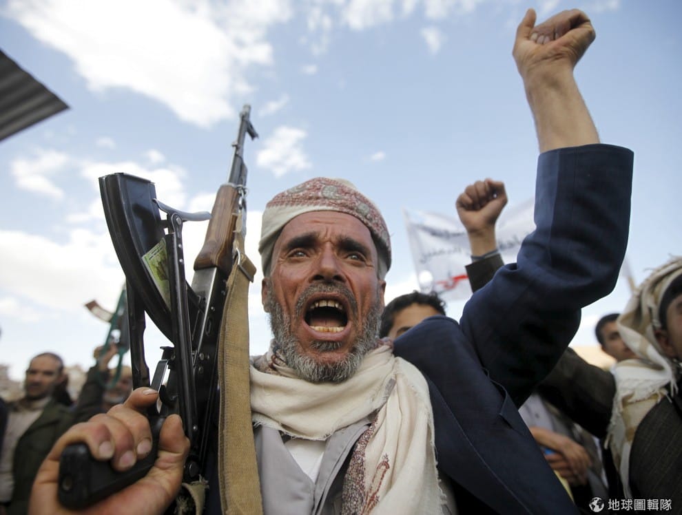 一名反政府胡西組織的支持者上街示威,他高舉長槍喊出反美的口號,不滿美國支持由阿拉伯國家帶領的空襲行動,造成當地不少房舍倒塌,人民頓失家園。面對葉門戰事持續延燒,再加上阿拉伯聯軍不斷轟炸港口,造成救援物資無法送進葉門,聯合國去年曾警告當地,如果再這樣下去,葉門民眾將面臨飢荒,全國將有無數人活活餓死。