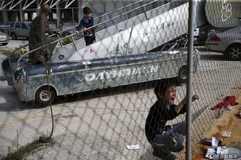 一名難民小男孩抓著圍欄嚎啕大哭,他身後的另一名孩子則在廢棄的飛機階梯上走動。他們兩人所在之處是雅典當地一座廢棄機場,許多流離失所的難民都被暫時安置在此處等待進一步通知,大部分難民都來自阿富汗。近日,希臘和馬其頓邊界開始限制非敘利亞難民入境,讓許多阿富汗難民進退兩難,他們躺在邊界的鐵軌上抗議,表示就算死也不要回去。