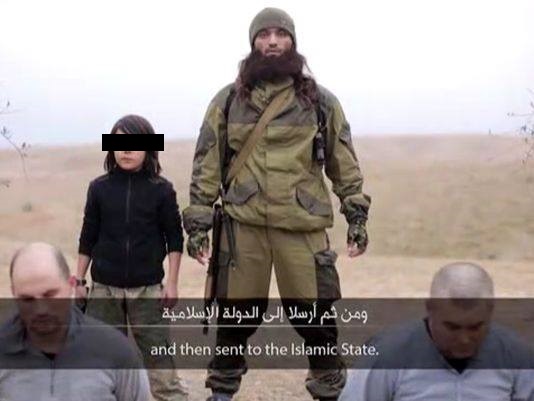 2015年一名 12歲的男孩跟著伊斯蘭國士兵一起處決疑似是俄國間諜的人犯。