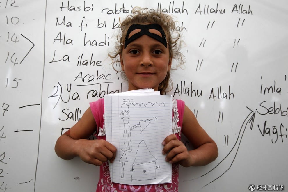 10歲的難民小妹妹聖卡爾(Meriya Senkar)對攝影師秀出她畫的「夢想中的家」。