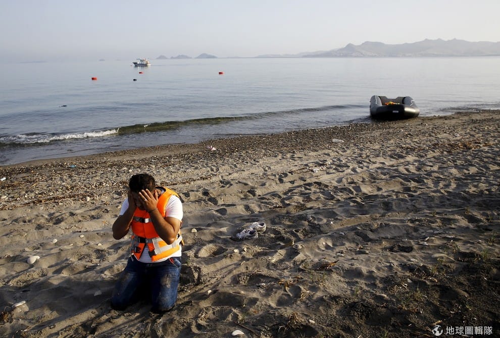 終於抵達希臘岸邊的敘利亞難民,跪在沙灘上向神祈禱。