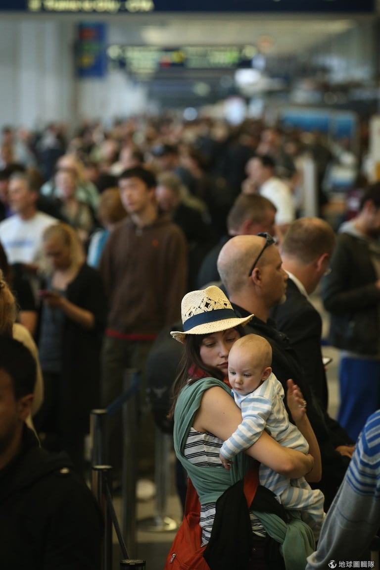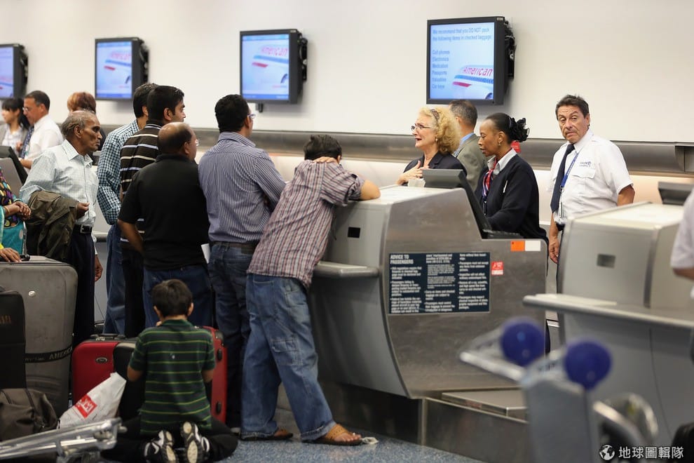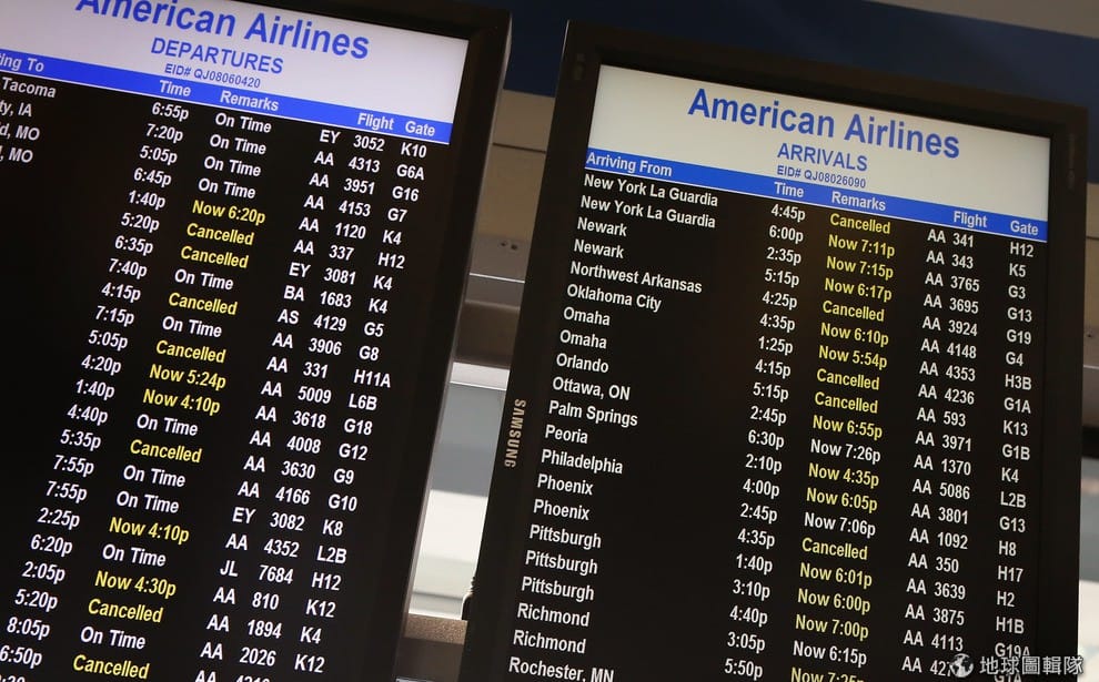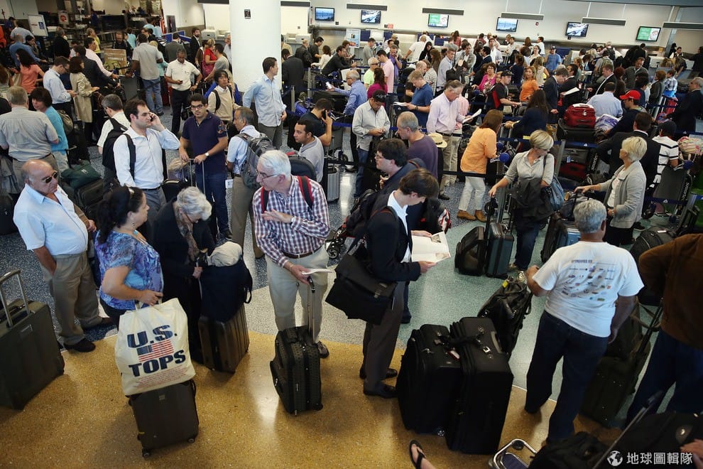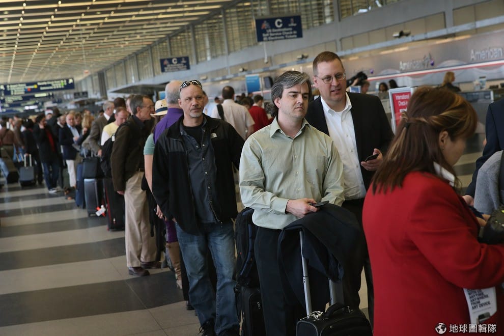 原本要在紐約和達拉斯、洛杉磯等地往來的乘客,全都無奈地重新排隊等待劃位。Scott Olson/Getty Images