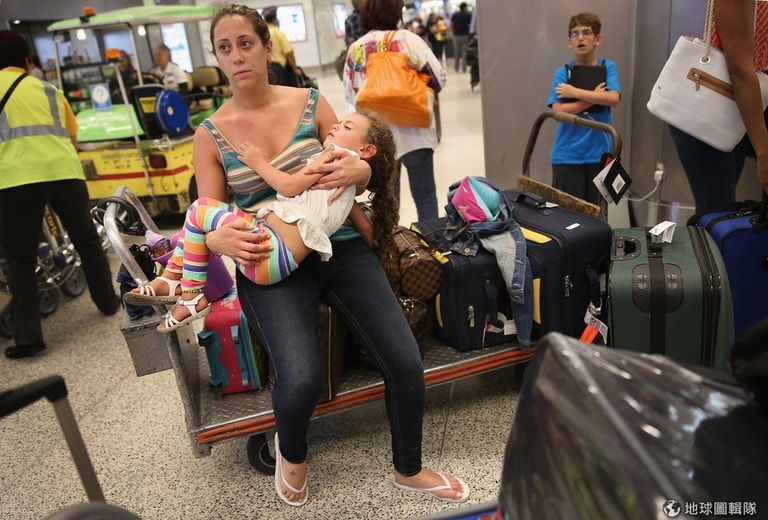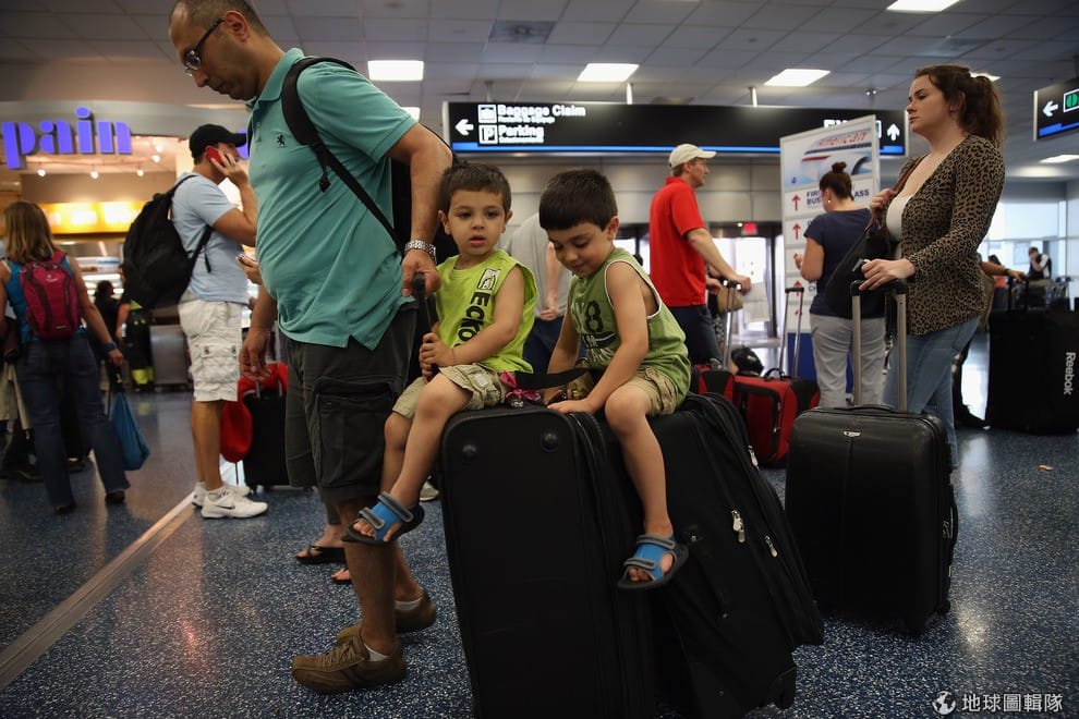 帶著小孩的爸爸媽媽只能無奈的邊安撫寶貝邊等著重新劃位。Scott Olson/Getty Images