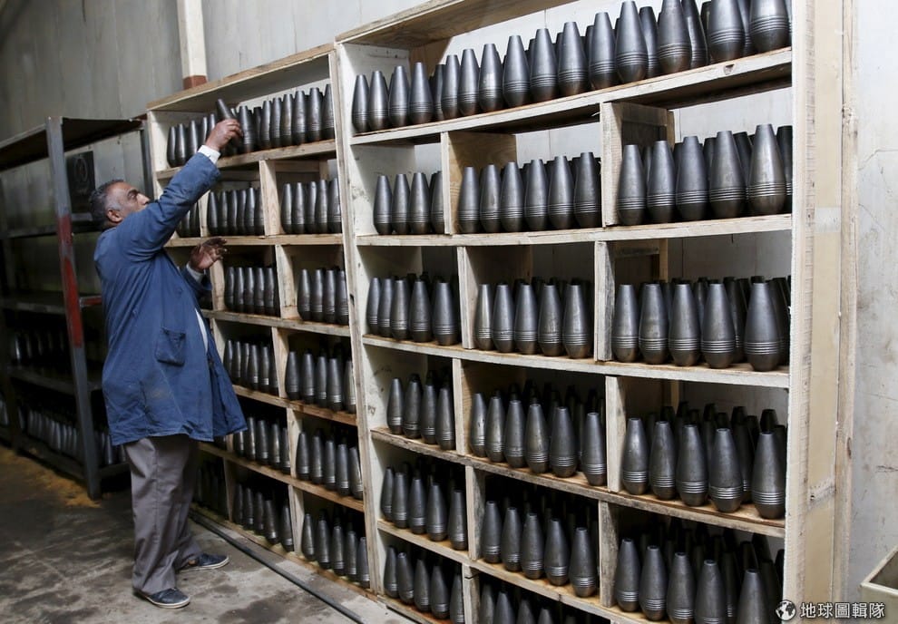一名男子將做好的迫擊砲彈一顆顆地排列在架上。目前,伊拉克境內受到恐怖組織伊斯蘭國(IS)的威脅,伊斯蘭國的宣傳手法也不斷推陳出新,計畫吸收更多聖戰士,其中,像一張白紙的娃娃兵就是他們的目標。
