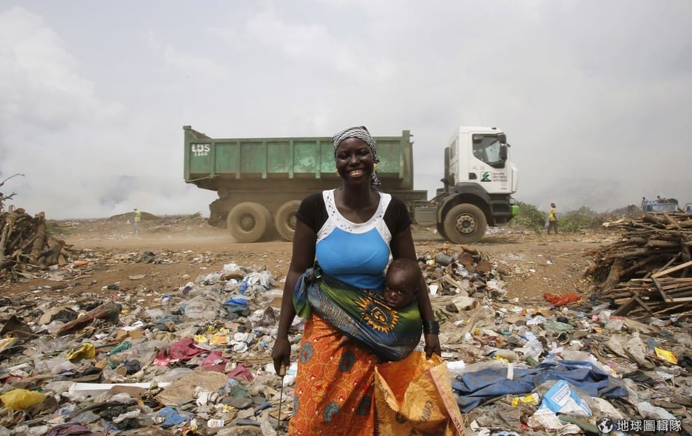 今年 23歲,將孩子綁在身上的資源回收工人巴蘿(Kalandjibo Balo)對著鏡頭咧嘴笑。