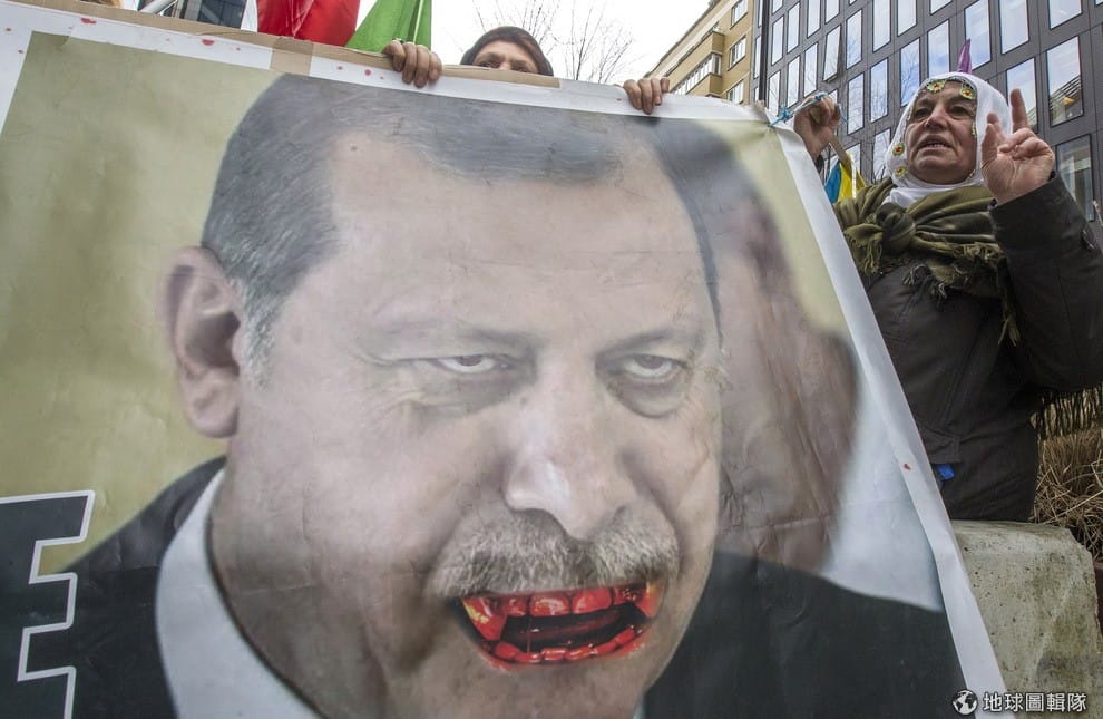 歐土峰會(EU-Turkey summit)正在布魯塞爾召開,不滿土耳其總統埃爾多安(Tayyip Erdogan)長年打壓的庫德族人,將總統的肖像畫成張著血盆大口的怪物,上街遊行抗議。