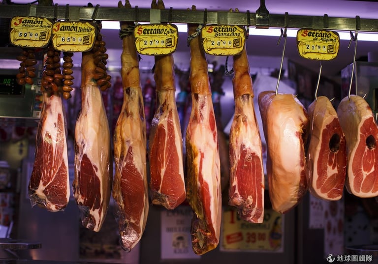 首都馬德里的市集掛著一條條伊比利火腿。伊比利火腿是西班牙的代表性美食,由放養在西南部,以橡果維生且數量稀少的黑豬製成,號稱火腿界的勞斯萊斯,更與中國的金華火腿、義大利的帕爾瑪火腿合稱世界三大名腿。