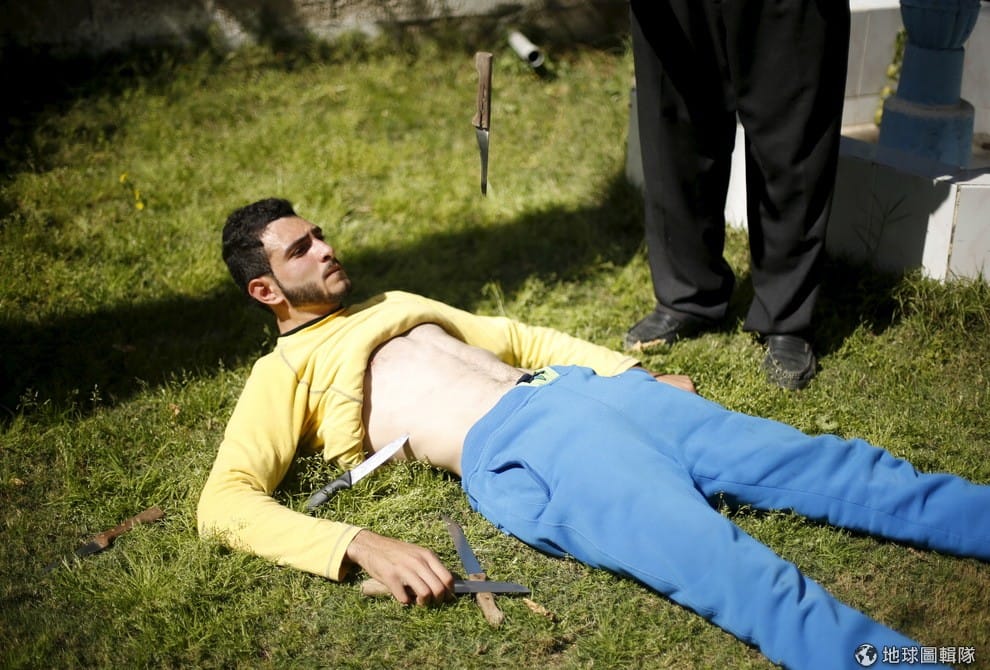 今年 20歲,人稱加薩走廊的參孫(Samson, 註)的巴拉卡(Mohammad Baraka)正用毫無防備的肚子接住掉落中的短刀,過去兩年來,他靠著這項表演走紅當地,被譽為加薩走廊最強壯的男人。