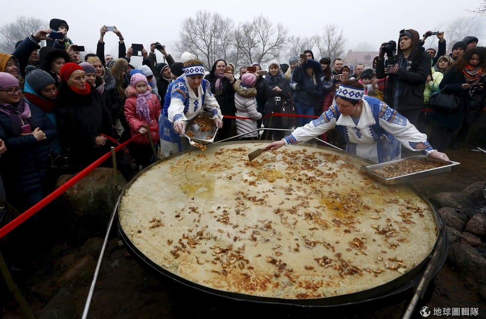 身穿藍白色傳統服飾的廚師,將培根撒在直徑兩公尺的大型薯餅上,希望待會薯餅出爐後,可以進入金氏世界紀錄。薯餅是白俄羅斯的傳統料理,當地也因氣候的關係盛產馬鈴薯,根據統計,每年每位白俄羅斯人就要吃掉 180公斤的馬鈴薯。