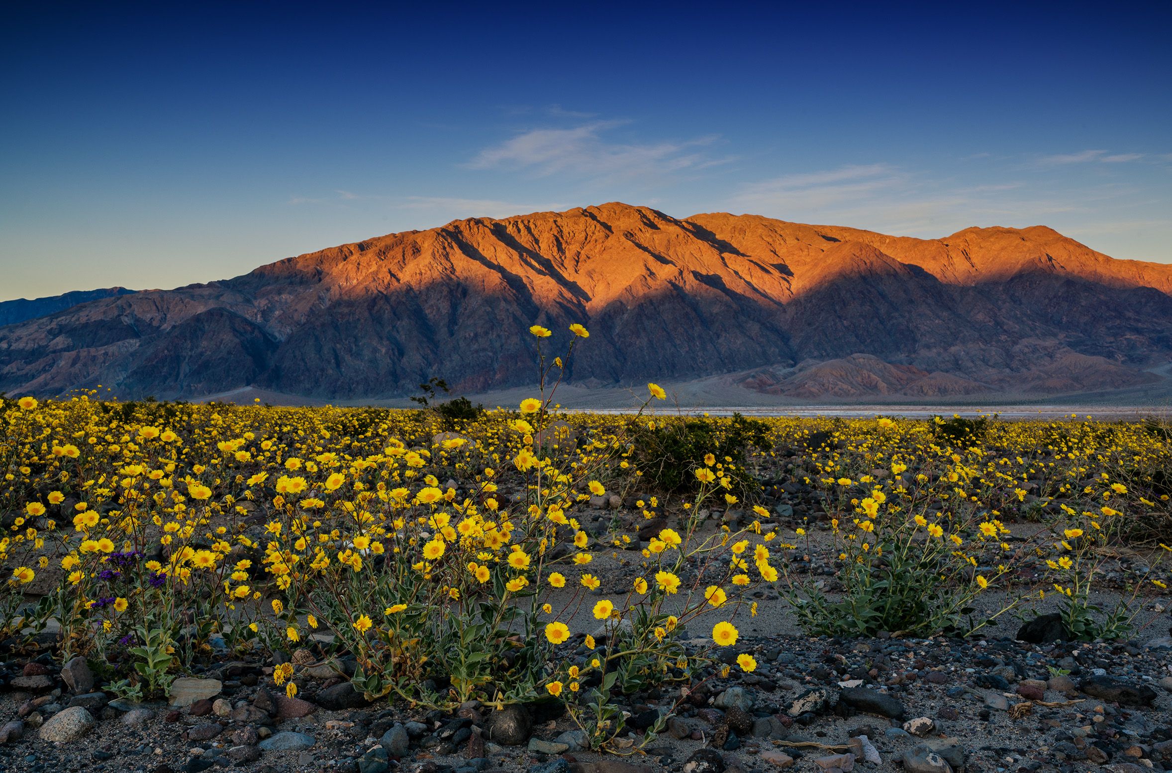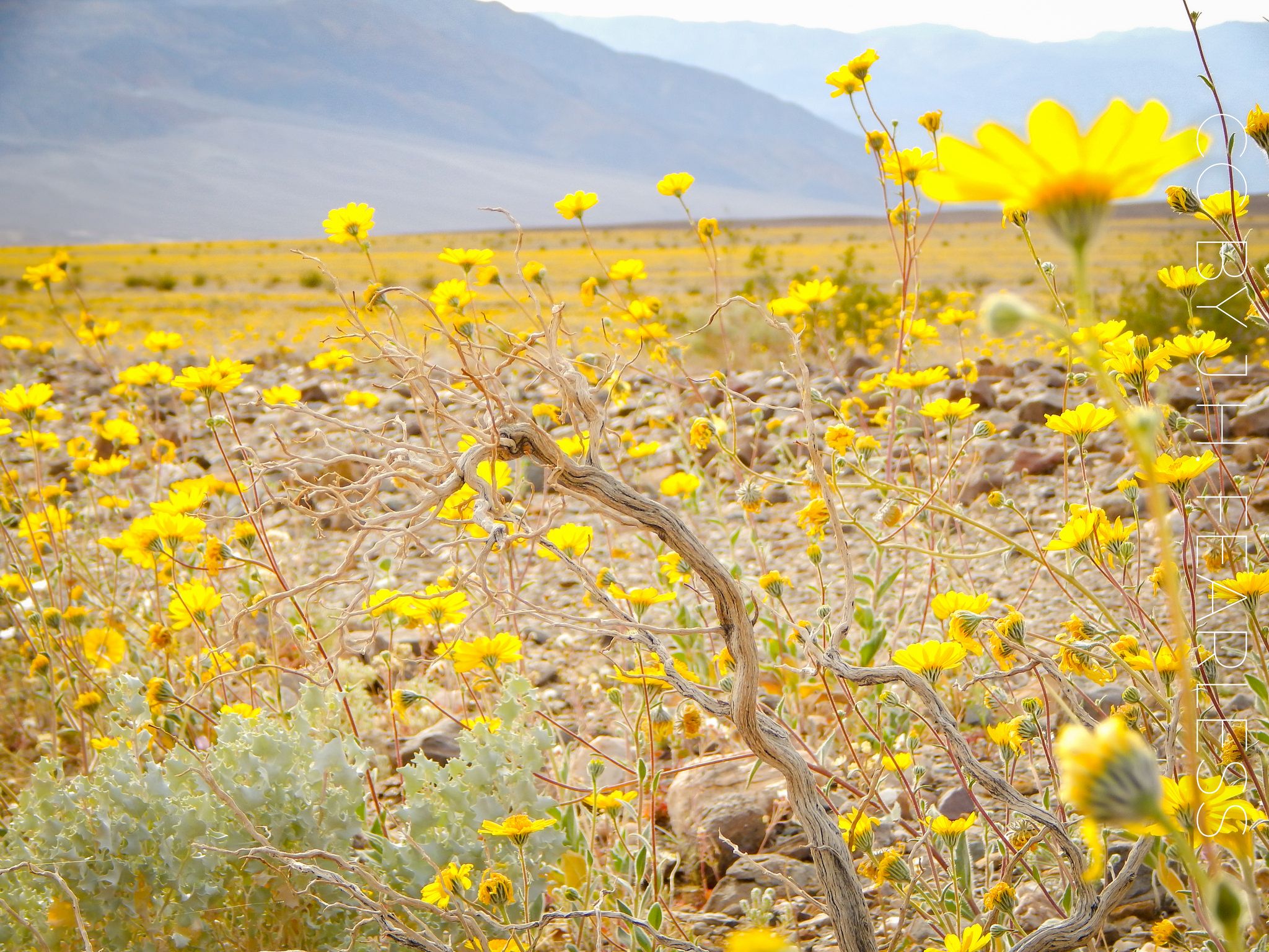 去年 10月的前兩個星期,死亡谷出現了 3次罕見的暴風雨,為死亡谷部分地區帶來 3英吋(約 76.2公厘)的雨量,雨水雖然不多,但已經足夠滲入土裡,讓數百萬顆野花種子從冬眠中醒來。