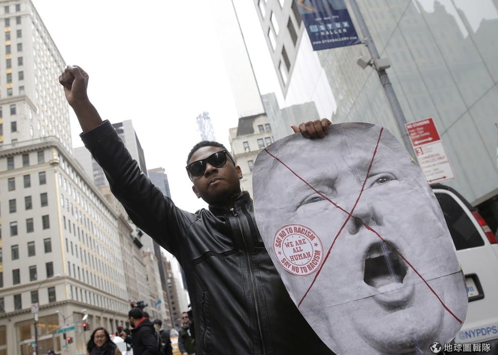 紐約曼哈頓市中心內,抗議總統參選人川普(Donald Trump)的民眾拿著牌子呼喊口號。2016年美國總統大選將在 11月時進行投票,目前美國上下都因為大選熱鬧不已,而支持與反對川普的民眾近期常傳出衝突消息,與川普立場不同的加拿大總理訪美也意外掀起了注目。