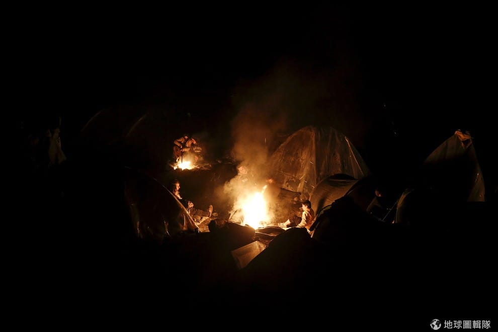 伊多梅尼的臨時收容區內,可見中東難民們窩在帳篷邊的營火。