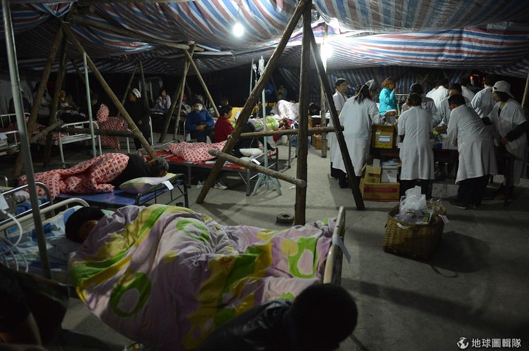 沒有家園的災民,以及傷者僅能先在臨時搭建的帳篷中安身。一旁的醫生團隊正在搶救傷患。ChinaFotoPress/Getty Images