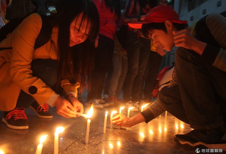 週六的地震引起中國和全球的關注,目前已知有207人不幸在地震中喪生。照片中是山東省聊城市的學生,他們點起燭火為災民祈福。ChinaFotoPress/Getty Images