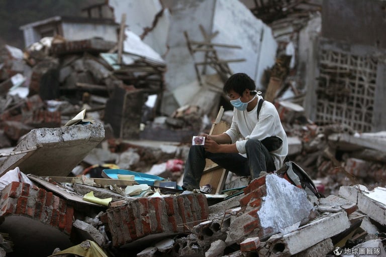 2008年當時有許多人湧進災區幫忙救援,照片中是當地的義工,他坐在搗毀的磚瓦間看著剛找到的一張照片。ChinaFotoPress/Getty Images