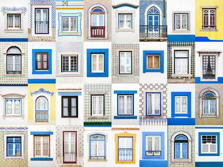 在葡萄牙的海岸城市埃里賽拉,窗戶以藍白搭配為主,磁磚藝術也沒缺席,交織成一幅清爽的畫面。
