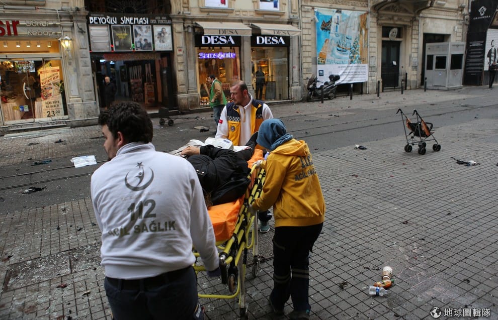 伊斯坦堡當地,救護人員正忙著將傷者送往醫院。伊斯坦堡在 19號時再度傳出自殺炸彈攻擊,造成至少 5人死亡, 36人受傷。