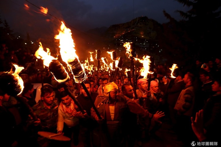 伊拉克境內的庫德族自治區,可見歡慶新年諾魯茲節的民眾舉起火把前行。