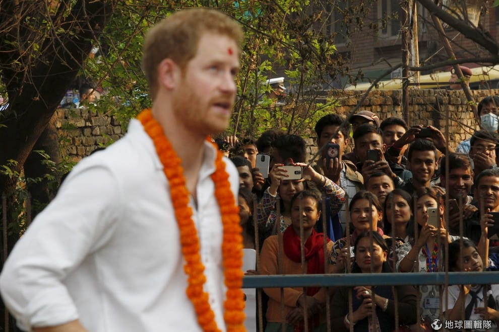 英國王子哈利(HRH Prince Henry of Wales)到訪尼泊爾,參訪當地防震物資中心的籌建情形,不遠處可以看到民眾擠在一塊想目睹哈利風采。
