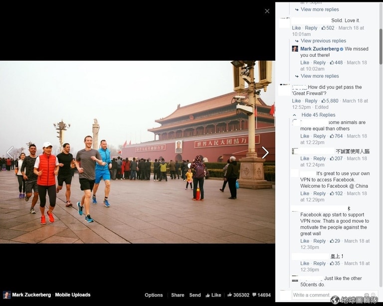 最近一次訪問,祖克伯表達「與中國友好」的行動再度引起熱議:他上傳了一張在天安門前路跑的照片,隨即在Facebook上引爆話題,網友問:「馬克,你知道你跑過的地方在 27年前發生過坦克車和槍枝的血腥鎮壓嗎?」、「你知道在這麼髒的空氣中跑步對健康有害嗎?」