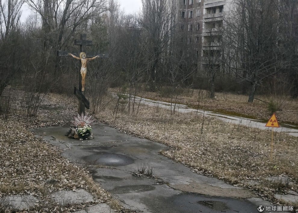 普里比亞特(Pripyat)當地,廢棄馬路上可見十字架。普里比亞特位於前蘇聯烏克蘭基輔州靠近白俄羅斯邊界的地方,因為處於 1986年車諾比核事故的疏散區內而成為被廢棄的城市。在事故發生前人口約 49,400人。