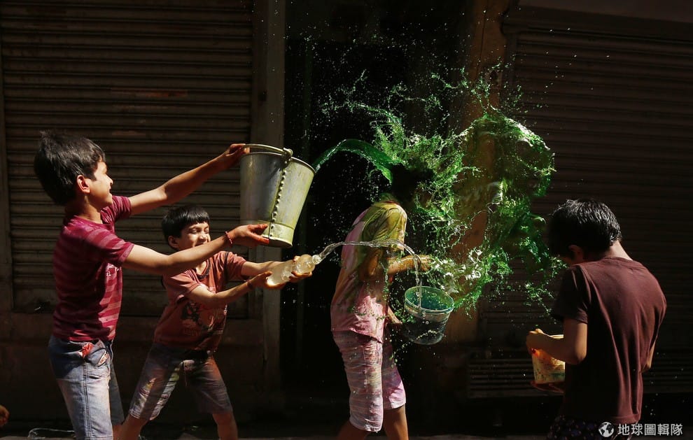 加爾各答當地,慶祝春天色彩節(Holi)的民眾互相潑灑彩色水。為了迎接春天到來,印度居民互相潑灑彩色粉末,一方面象徵告別冬季,一方面用各種繽紛的粉末代表春天色彩紛呈的景象!