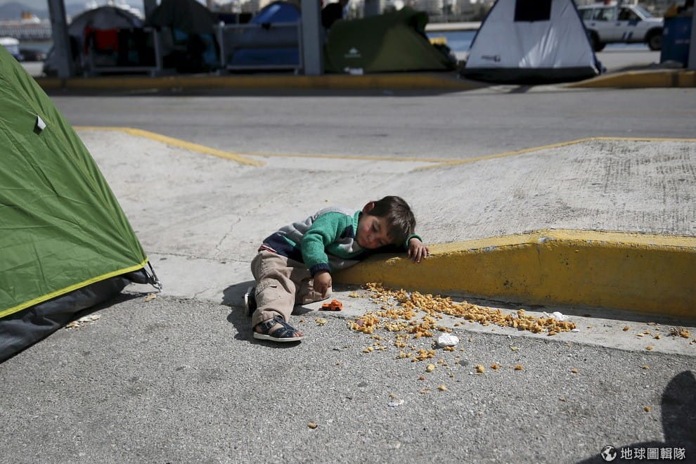 雅典當地一處難民營中,小男生坐在路旁玩玩具。日前比利時遭到恐怖份子攻擊,波蘭決定不要遵守歐盟的原定計畫接納難民,成為布魯塞爾恐攻之後,第一個表態拒絕難民的歐盟國家。