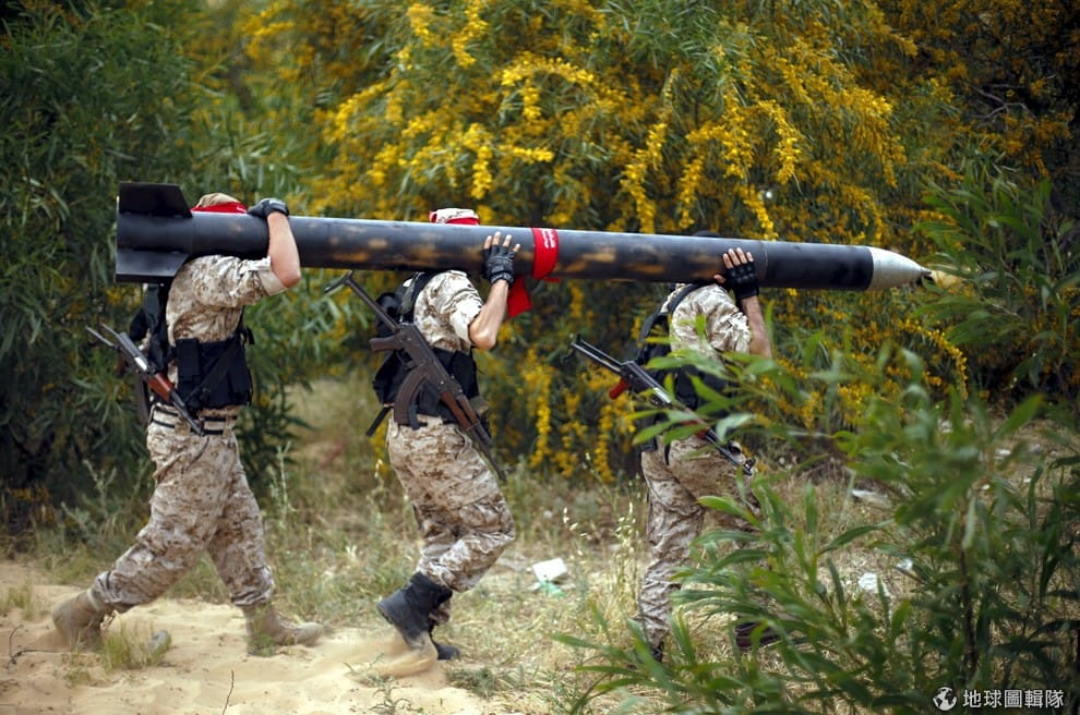 25號的演習中,巴勒斯坦士兵對記者展示他們自製的火箭砲。
