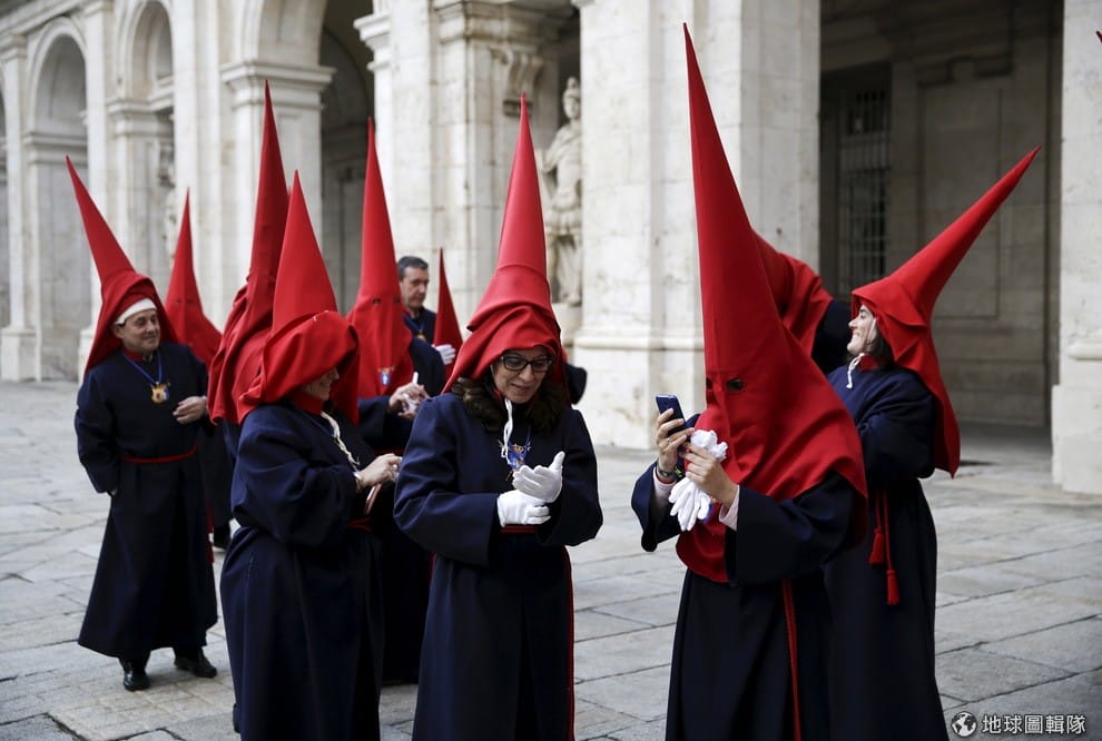 馬德里市區內,人們站在皇宮外等待當地兄弟會Santisimo Cristo de los Alabarderos所舉辦的聖周活動開跑。