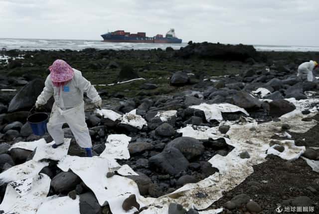 新北市石門外海,「德翔台北」貨輪日前因為船體遭海浪沖擊斷裂擱淺,鄰近海岸遭重油汙染,當地生態面臨浩劫,圖中可見工作人員搶救受汙海岸中。