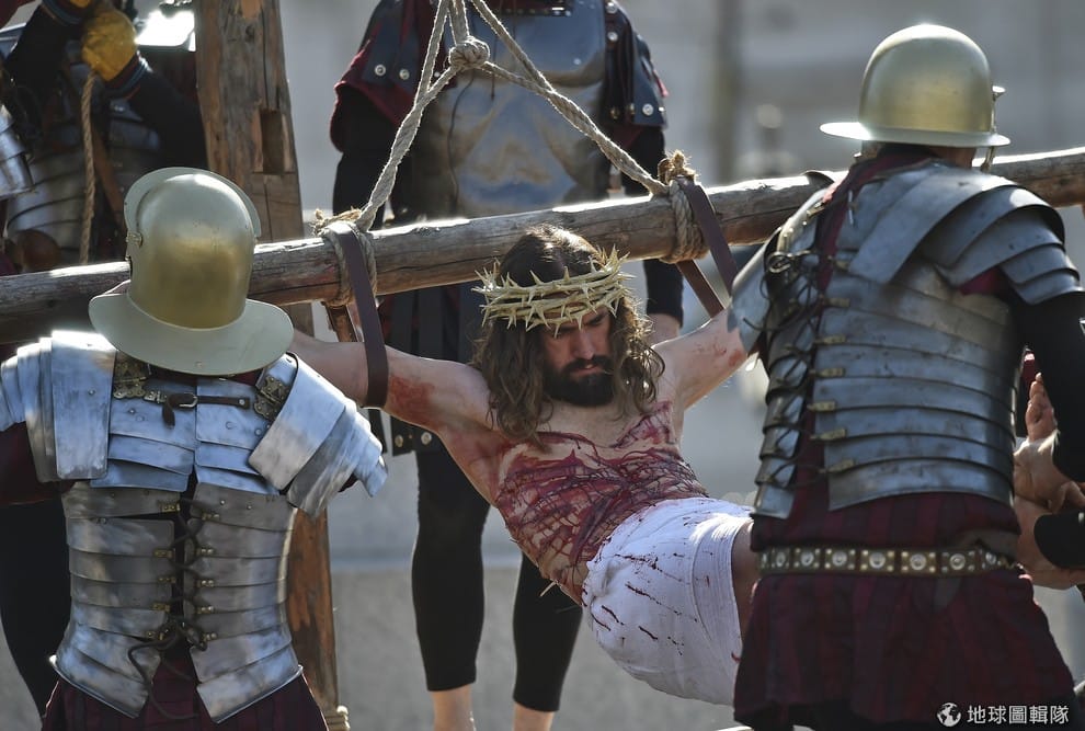 倫敦的特拉法加廣場(Trafalgar Square)上,演員博克鄧斯摩(James Burke-Dunsmore)再度重現耶穌基督殉難的場景,他從事這樣的活動已經有許多年。