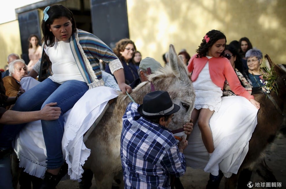 2名小女孩坐在驢子身上,準備參加聖周期間的阿塔拉亞聖母(Virgem da Atalaia)遊行。這個騎驢參加遊行的活動已經有 400年的歷史,起初只有單身女性可以騎驢子,請求聖母幫她們找到老公。